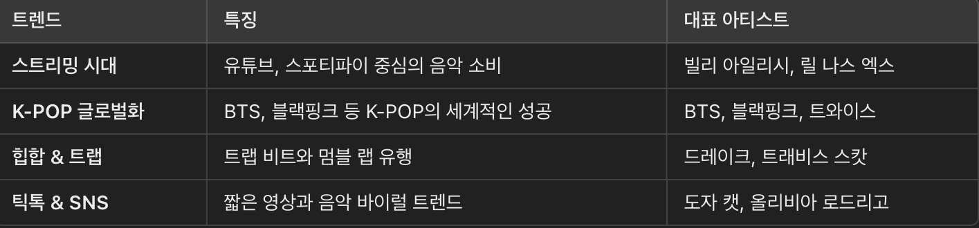 2010년대 이후 음악 산업은 스트리밍 서비스의 성장, K-POP의 글로벌 성공, 힙합과 팝 음악의 융합을 중심으로 빠르게 변화해왔습니다.