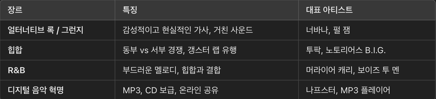 1990년대는 록, 힙합, R&B가 모두 강력한 영향력을 가진 시대였으며, 이후 2000년대 음악의 흐름을 결정짓는 중요한 역할을 했습니다.
